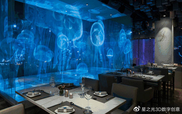 5D光影餐廳巧妙地將3D影像主題與音響、燈光系統(tǒng)完美結(jié)合,并與運(yùn)動(dòng)捕捉系統(tǒng)相結(jié)合,為用餐客人營(yíng)造一種沉浸式用餐空間,體驗(yàn)科技化帶來的視覺、觸覺、味覺的多種震撼。