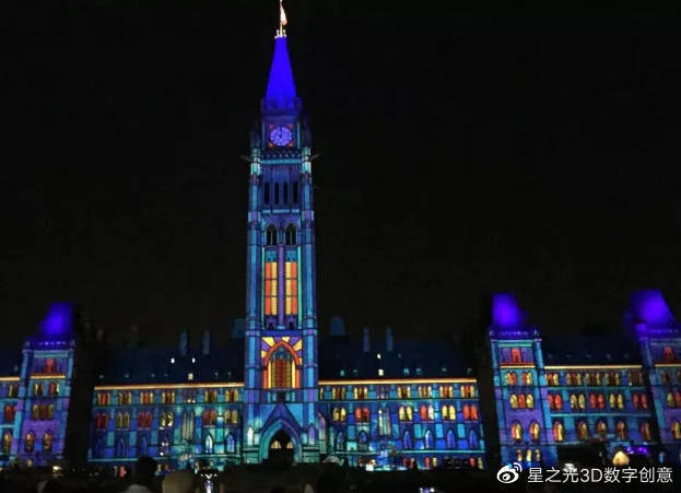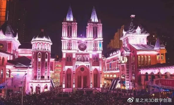 建筑投影利用室外投影技術,利用建筑物的表面作為投射媒介,將3D數(shù)碼動畫與墻壁投影媒體融合,形成三維立體圖像。在燈光的照耀下,墻壁像是“活了起來”,發(fā)生著千姿百態(tài)的變化。