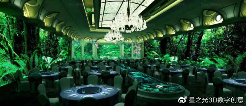 5D光影全息技術,可以讓每一座大廳都能容納五個不同的場景,讓客人們在五種視覺上都能感受到,還能在不占用太多空間的情況下,支付一筆不菲的租金,就能滿足客人們對美食的向往。