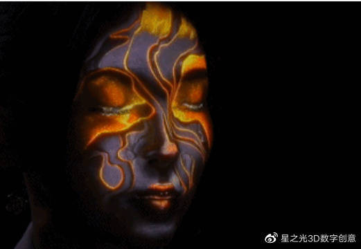 利用3D動(dòng)畫(huà)技術(shù),產(chǎn)生臉部藝術(shù)效果,再將其投影到人的臉部,從而構(gòu)成“影像面具”,從海洋、海豚到面具碎片,都是非常精細(xì)的。
