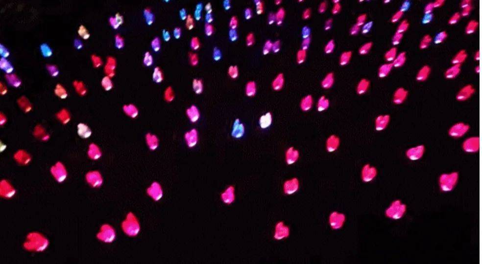 波光粼粼的郁金香花海和星星“隧道”,與燈光秀同步,不斷“舞動”,讓游客仿佛置身奇妙的童話世界,忍不住流連忘返。
